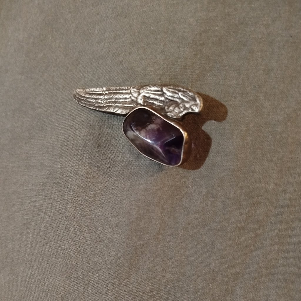 Ručně odlévaná brož vytvořena z odlitku křídla ve stylu ART DECO je doplněna divokým, omílaným ametystem.