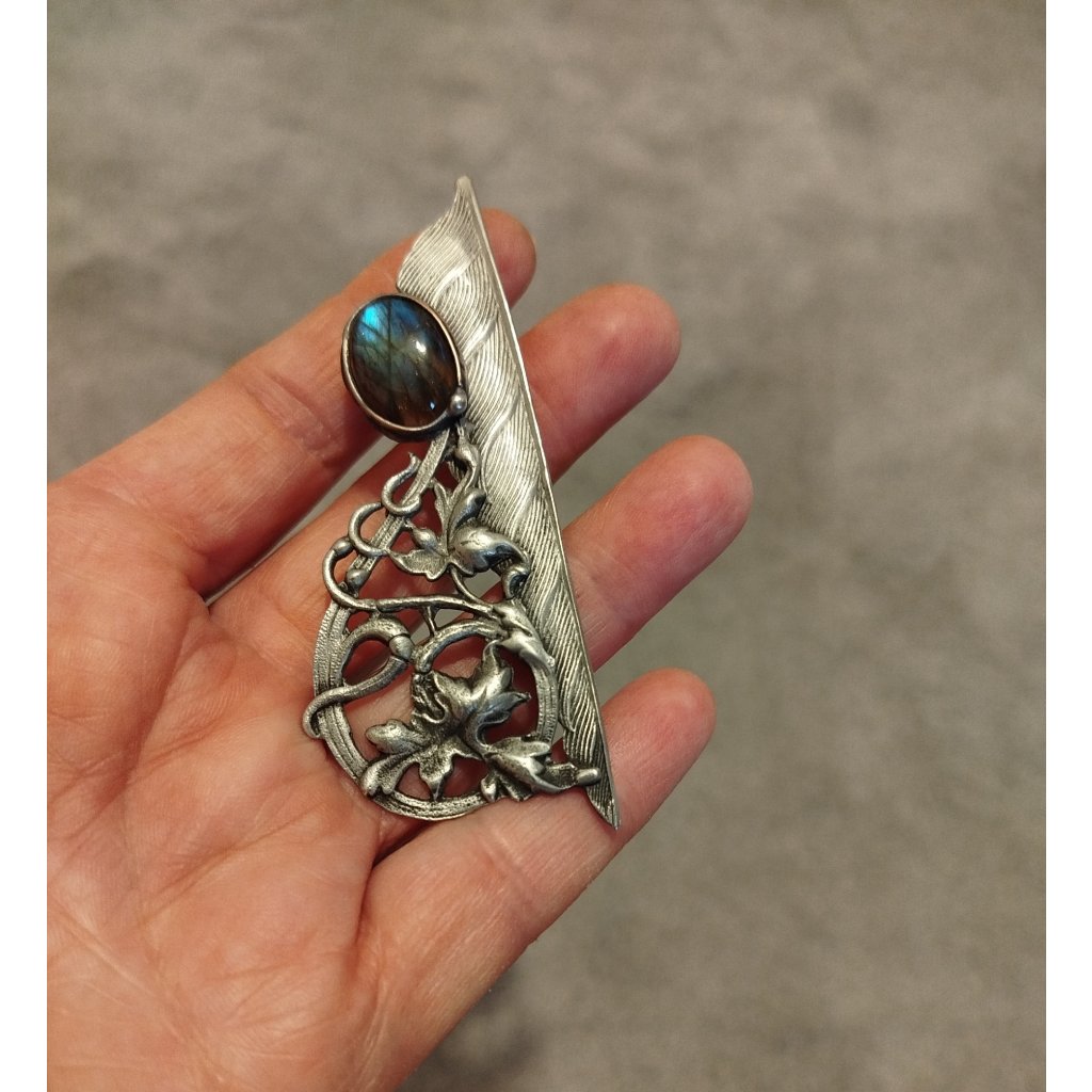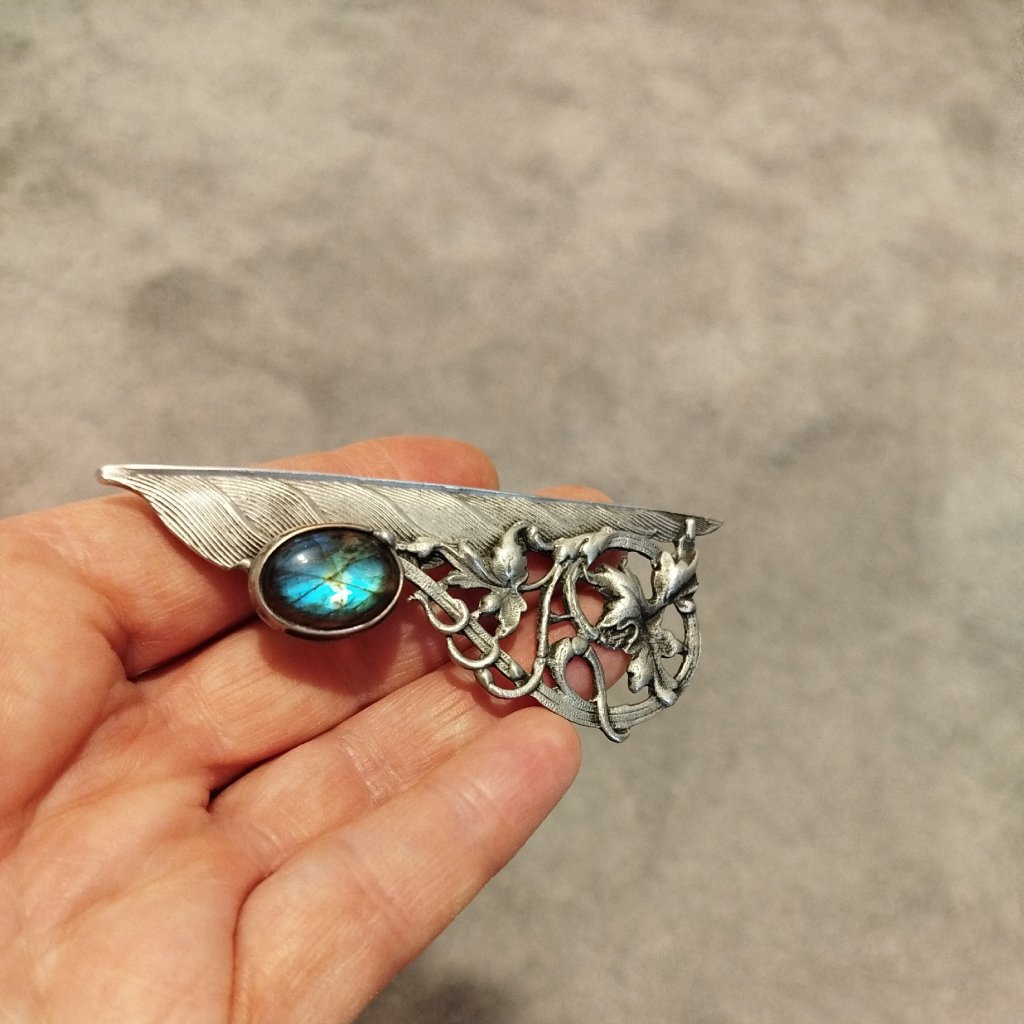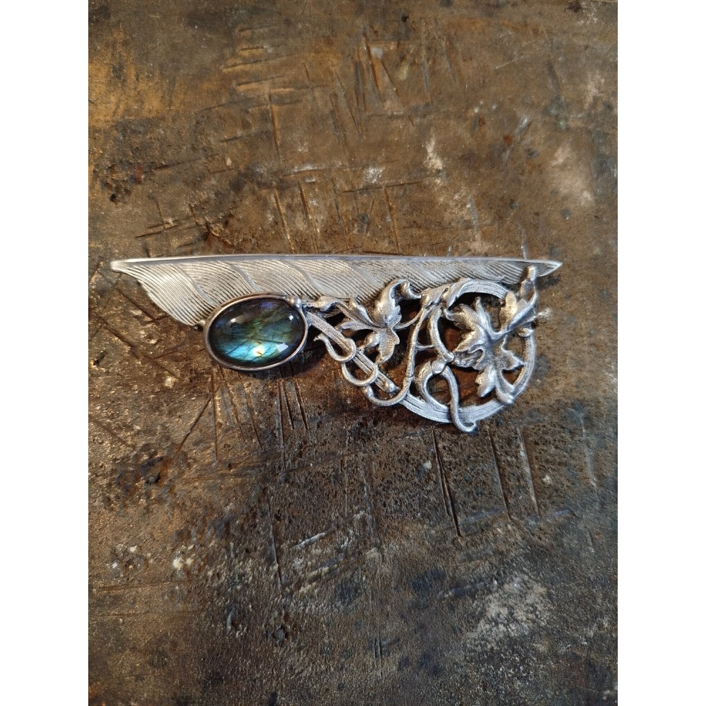 Brož v eklektickém stylu s labradoritem, velikosti 9 x 3,6 cm.