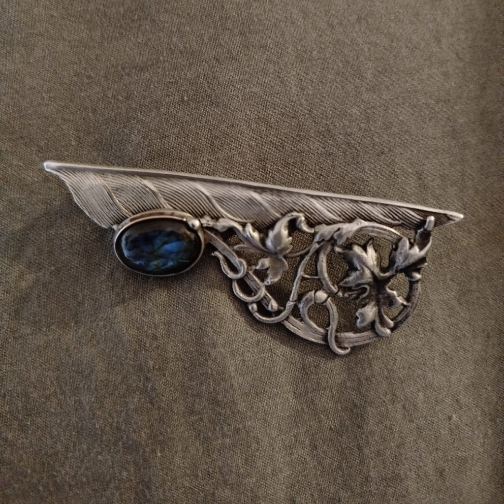 V tomto případě jsem ji vytvořila složením mých vlastních odlitků, secesního pírka, vinné krajky ve stylu historismu a minimalisticky orámovaného labradoritu.