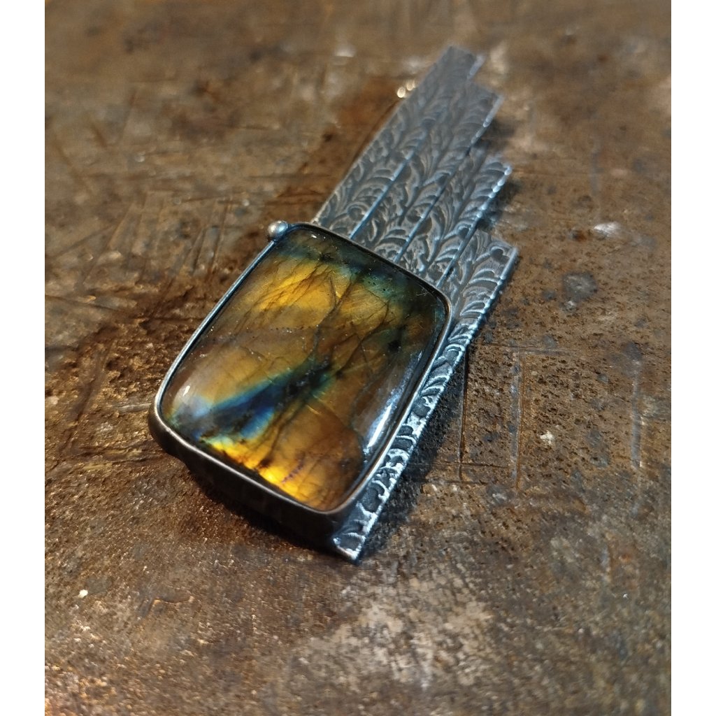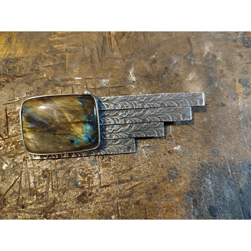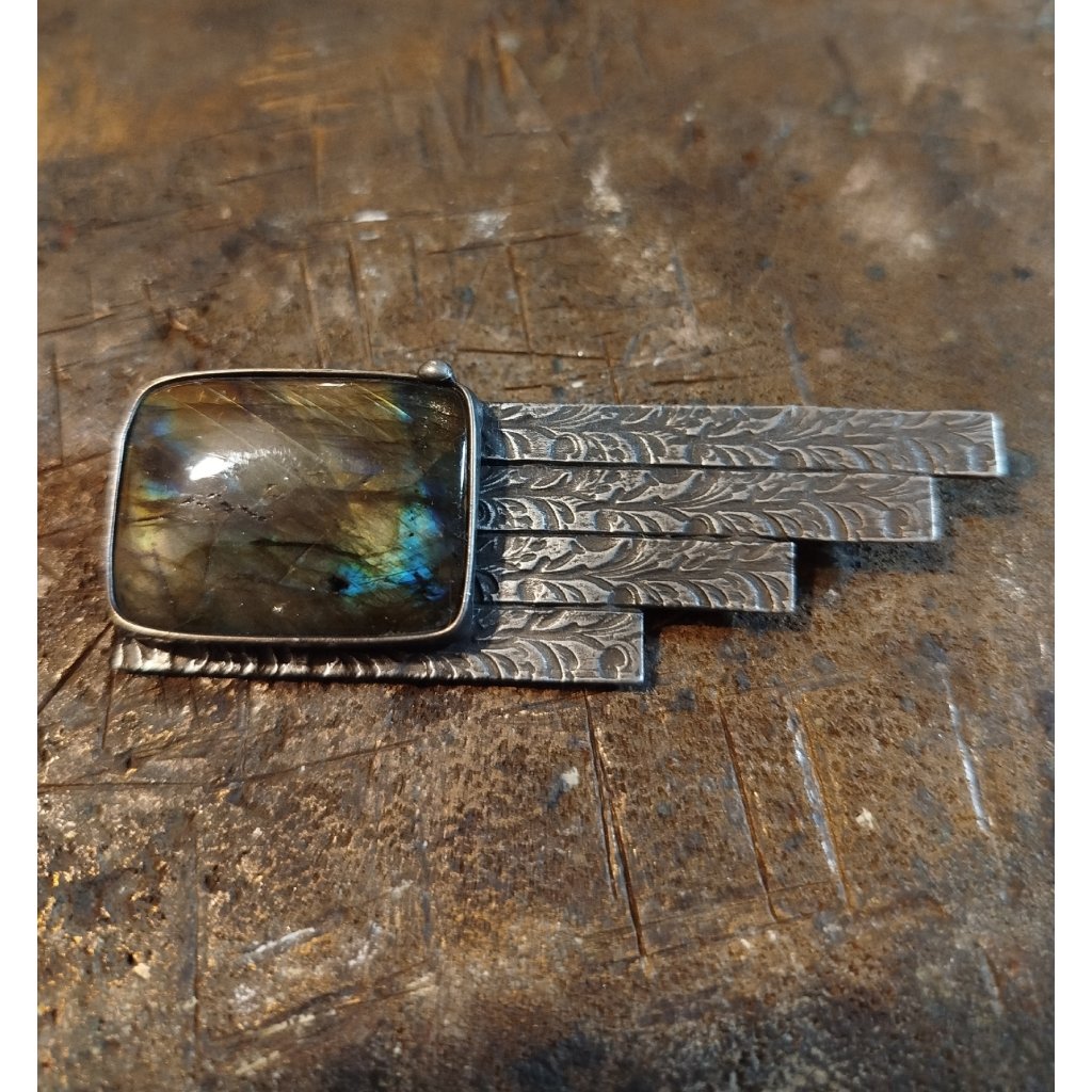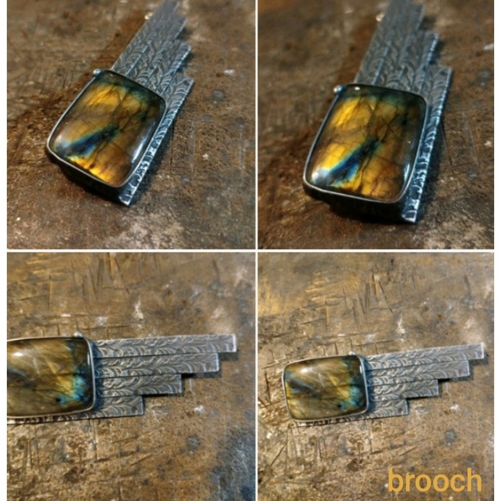 Ručně vyrobená brož je vytvořena z litého cínu. Do šperku je vsazený exkluzivní labradorit. Šperkový kámen v AA kvalitě.