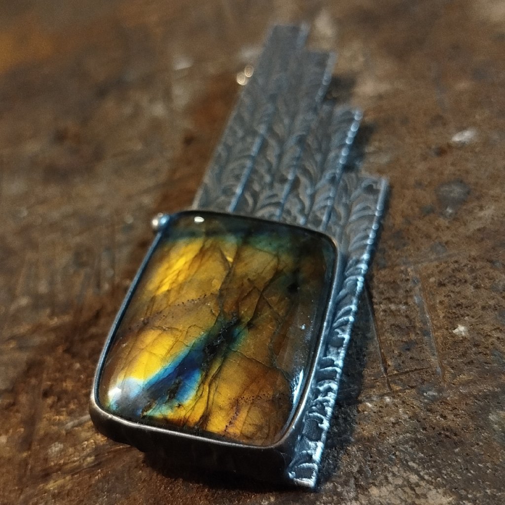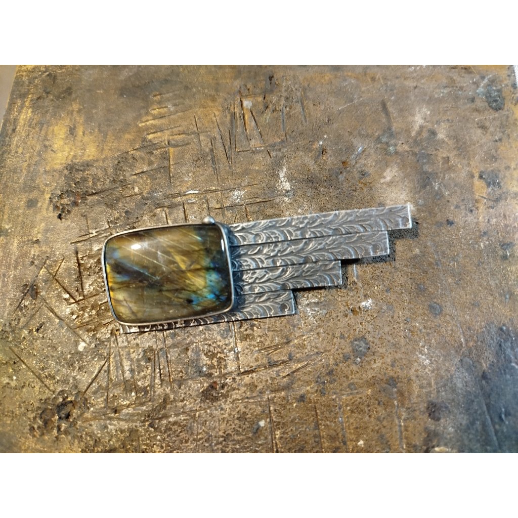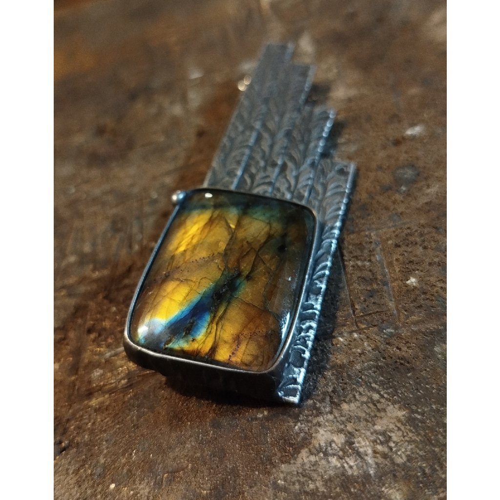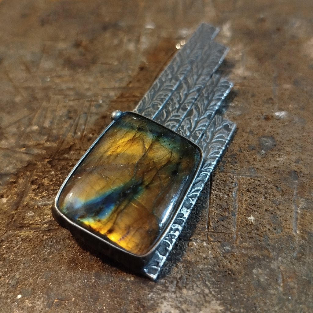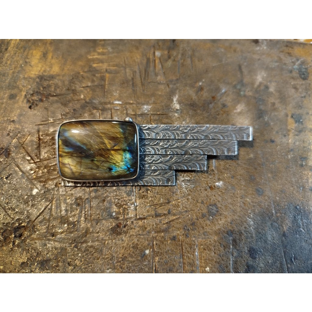Ručně vyrobená brož je vytvořena z litého cínu. Do šperku je vsazený exkluzivní labradorit. Šperkový kámen v AA kvalitě.