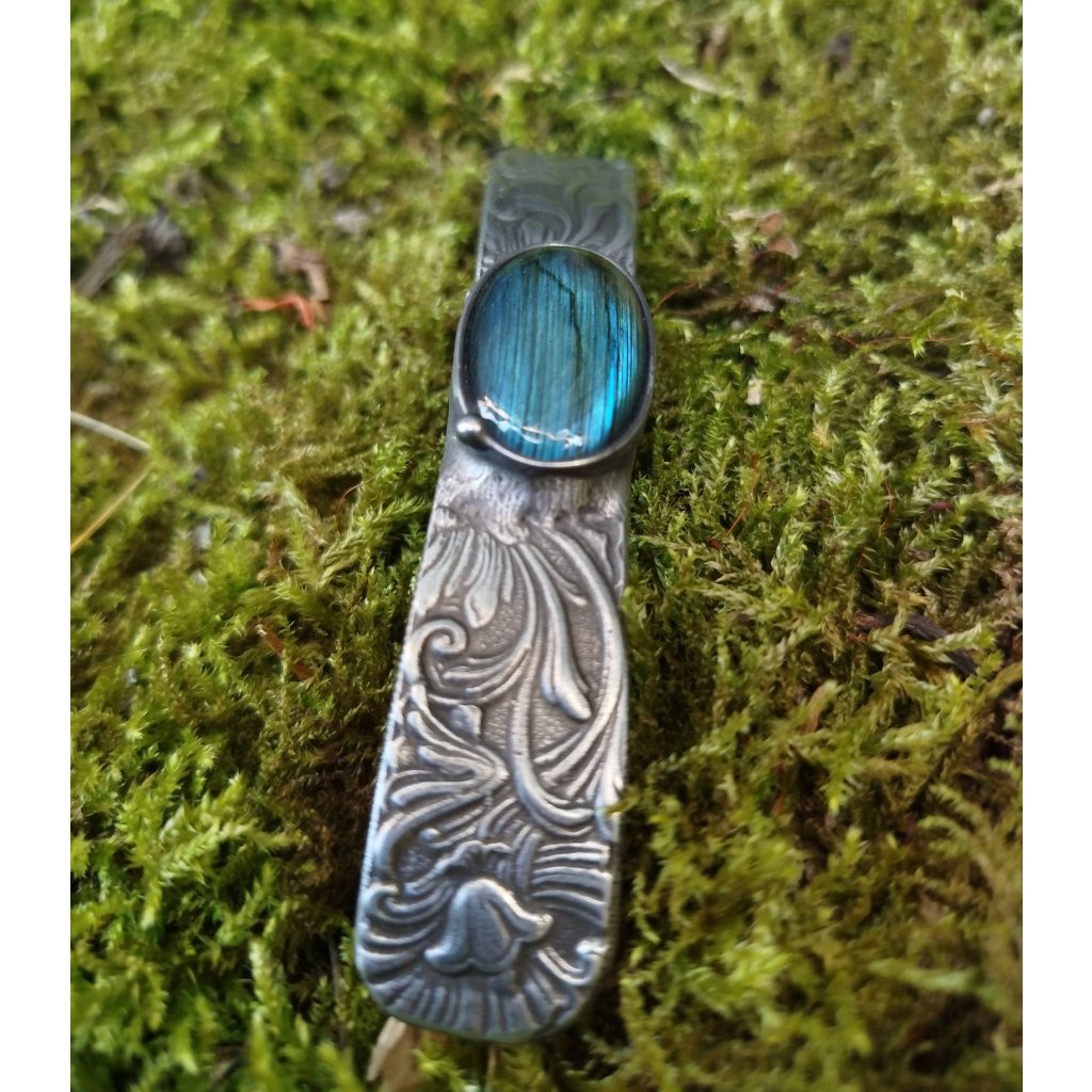 Cínová spona s florálním reliéfem a labradoritem – 9 cm clip