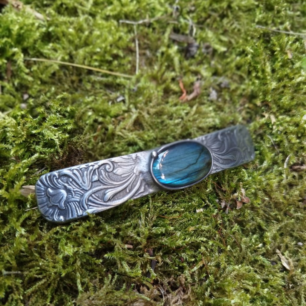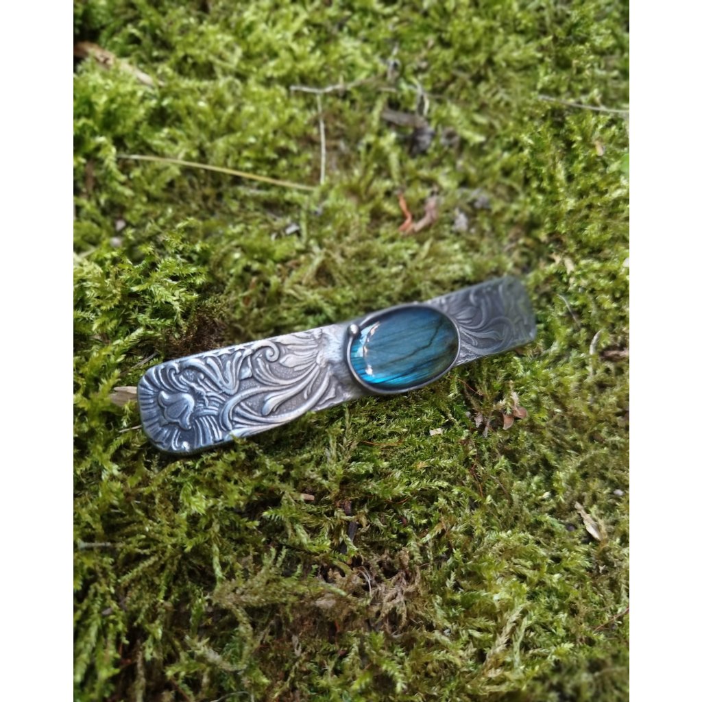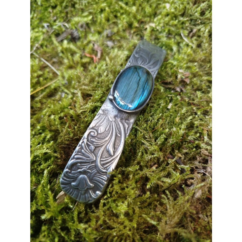 Elegantní cínová spona s jemným florálním motivem a výrazným labradoritem. Ručně zhotovený šperk pro vlasy, který spojuje krásu a funkčnost. Vhodná pro každodenní nošení i výjimečné chvíle.