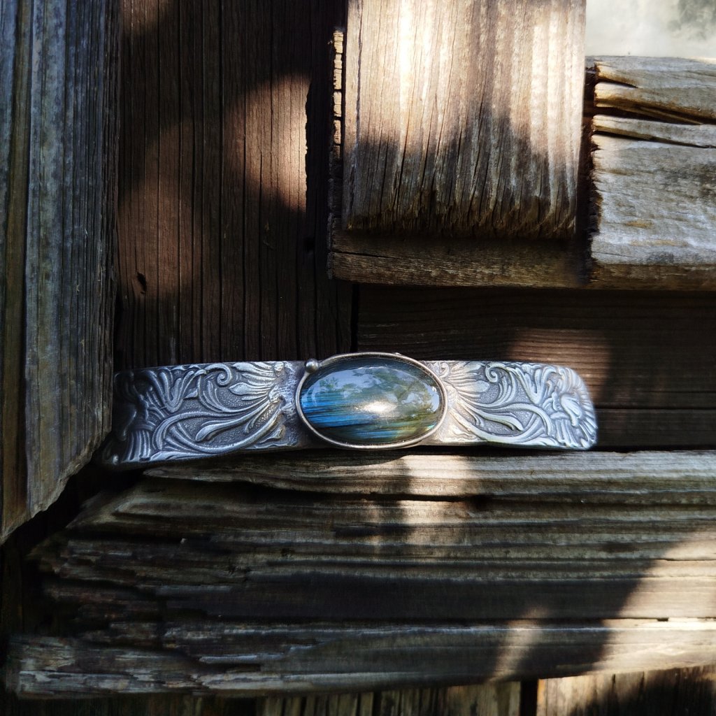 Ručně zhotovená cínová spona s jemným florálním reliéfem představuje dokonalé spojení umění, elegance a síly přírodních kamenů. Dominantním prvkem je labradorit – mystický kámen známý svými duhovými odlesky a schopností chránit a posilovat vnitřní energii.