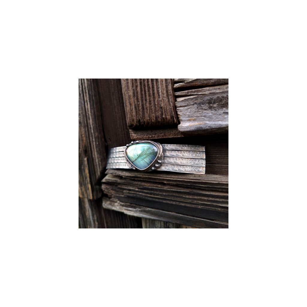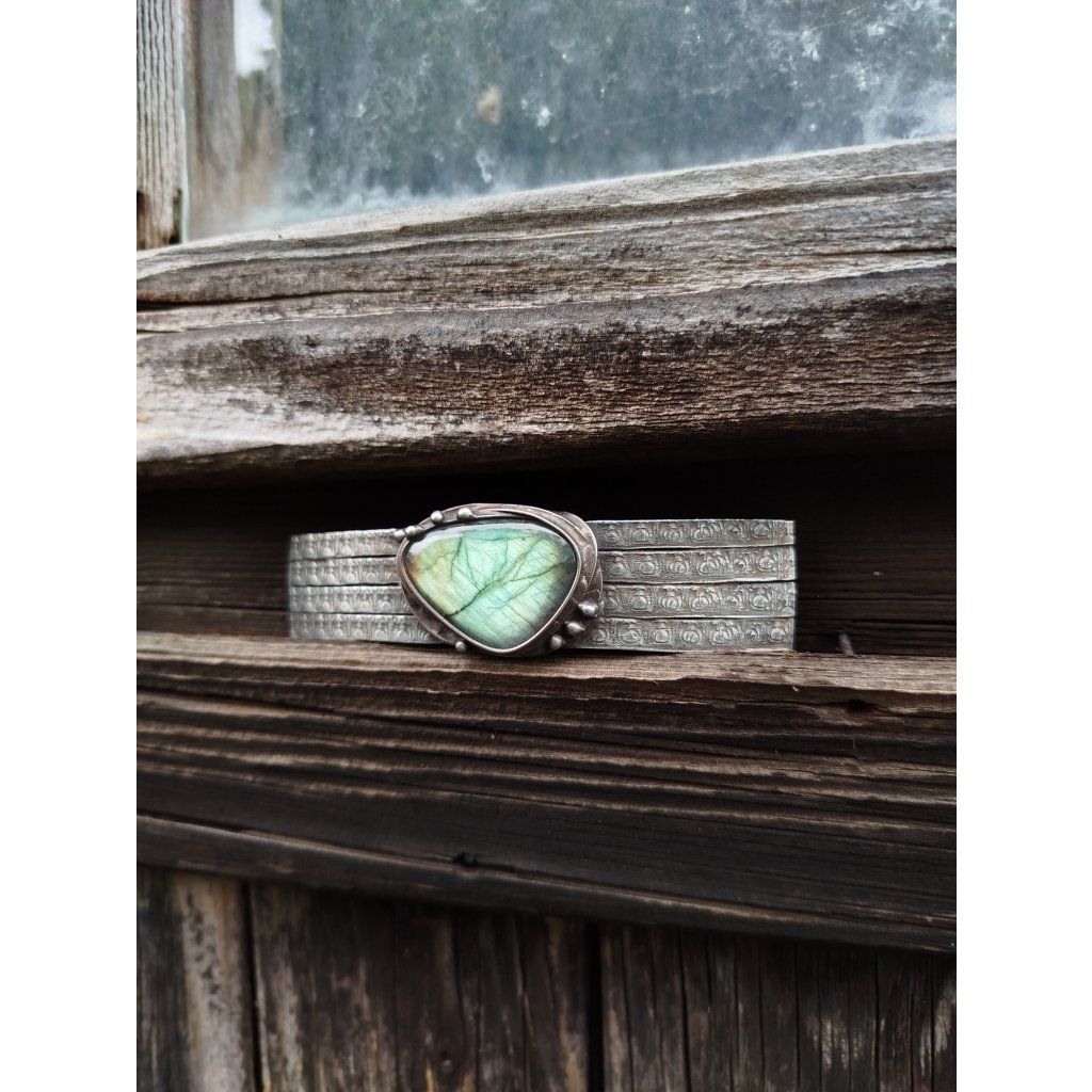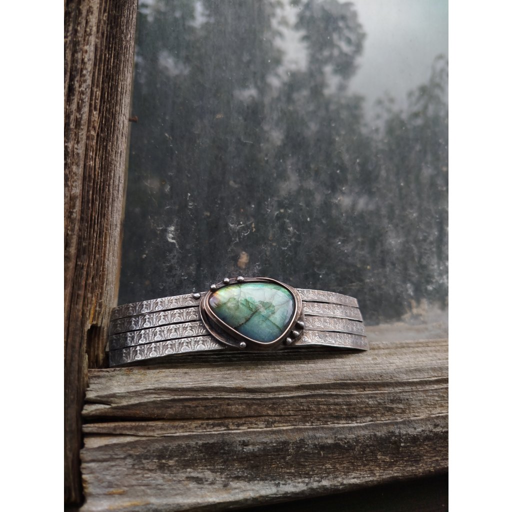 Originální, autorská spona do vlasů s labradoritem s velmi vzácnou labradorescencí a florálním motivem na odlitcích.