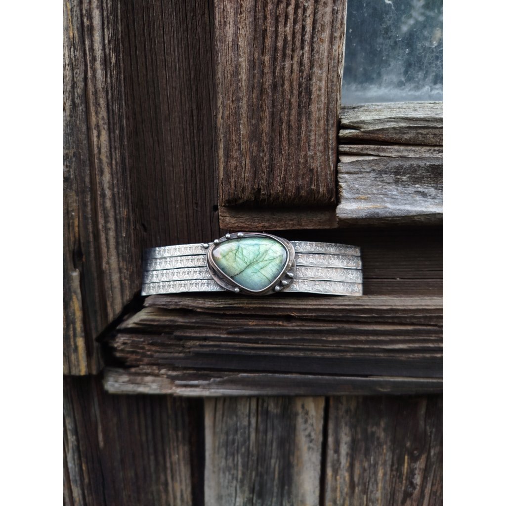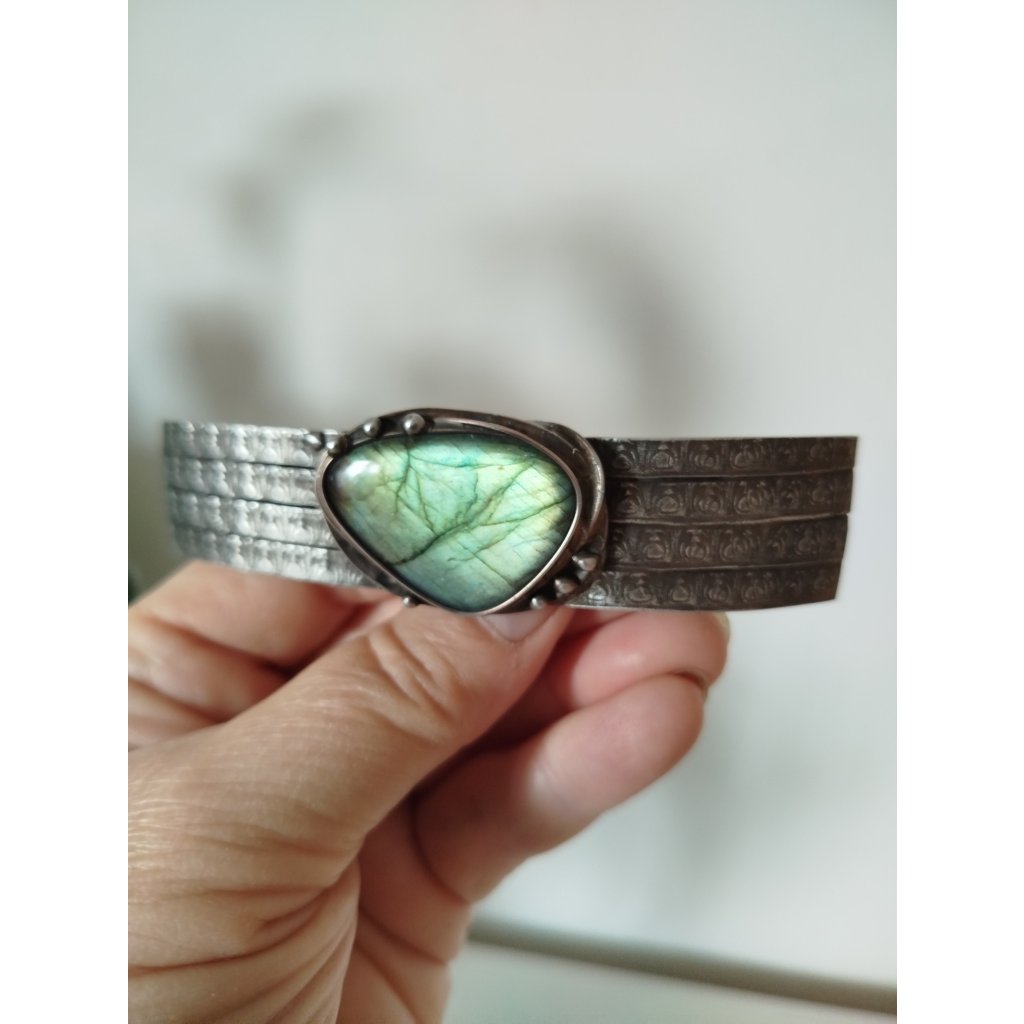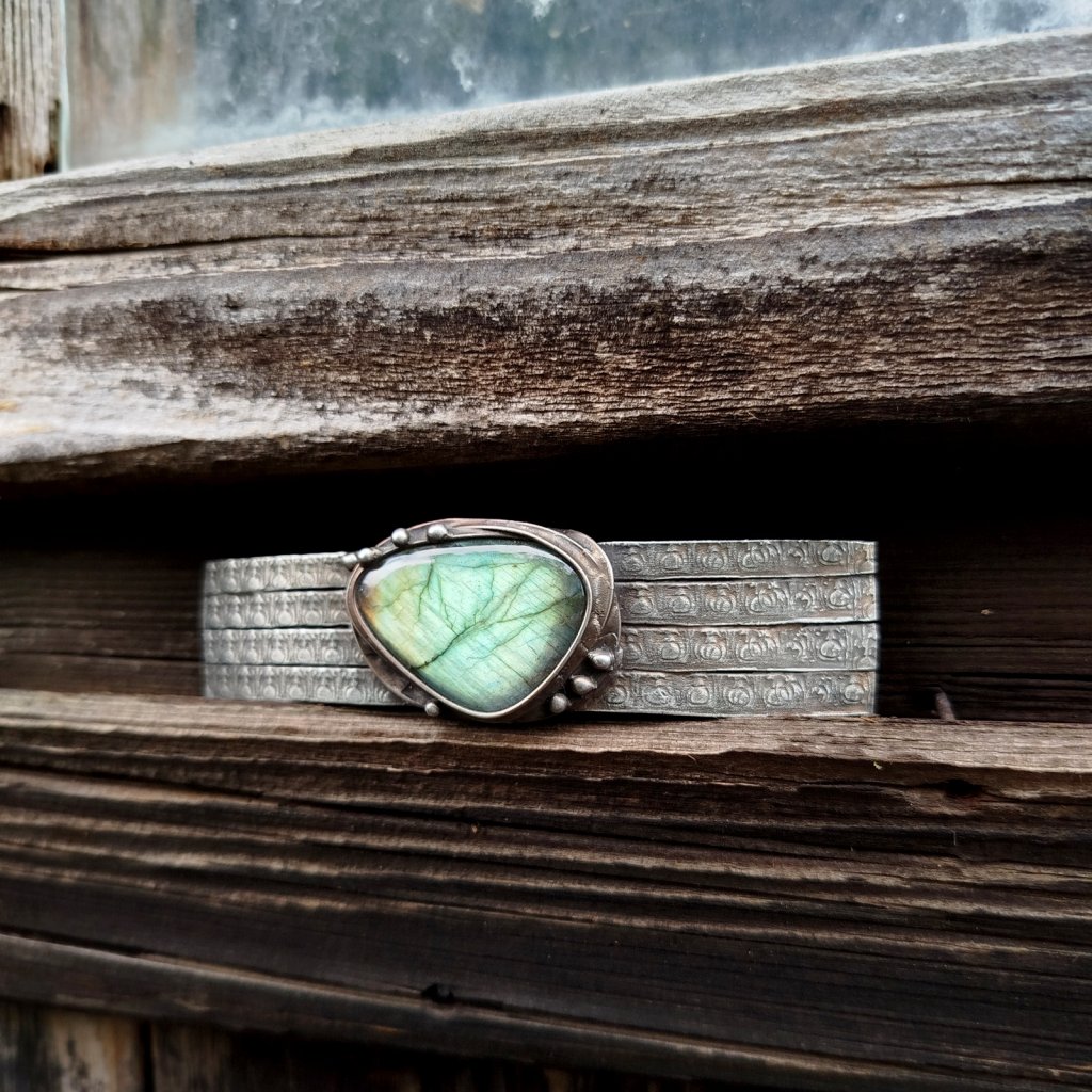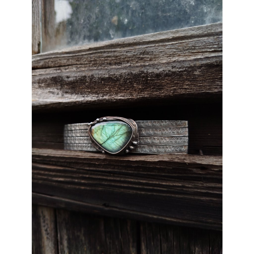 Originální, autorská spona do vlasů s labradoritem s velmi vzácnou labradorescencí a florálním motivem na odlitcích.