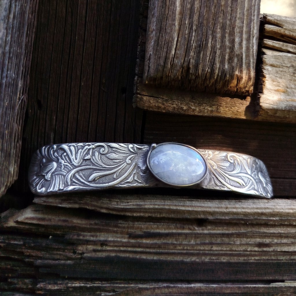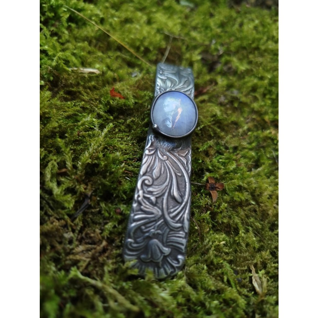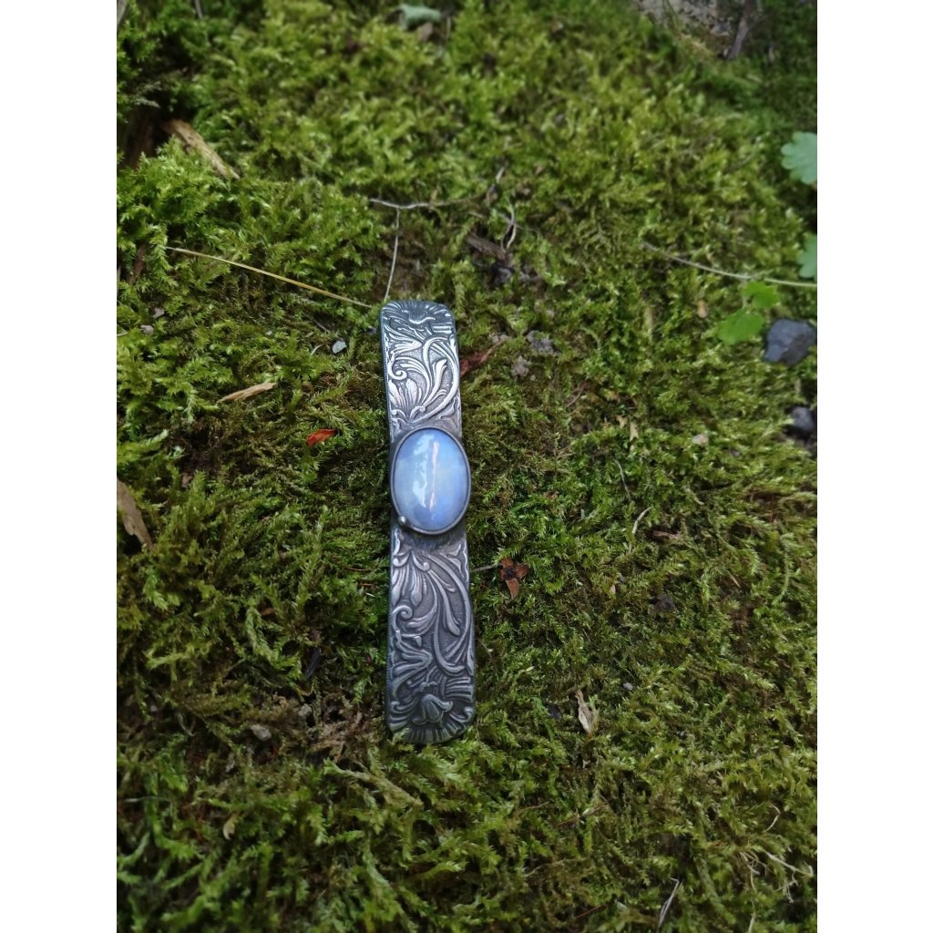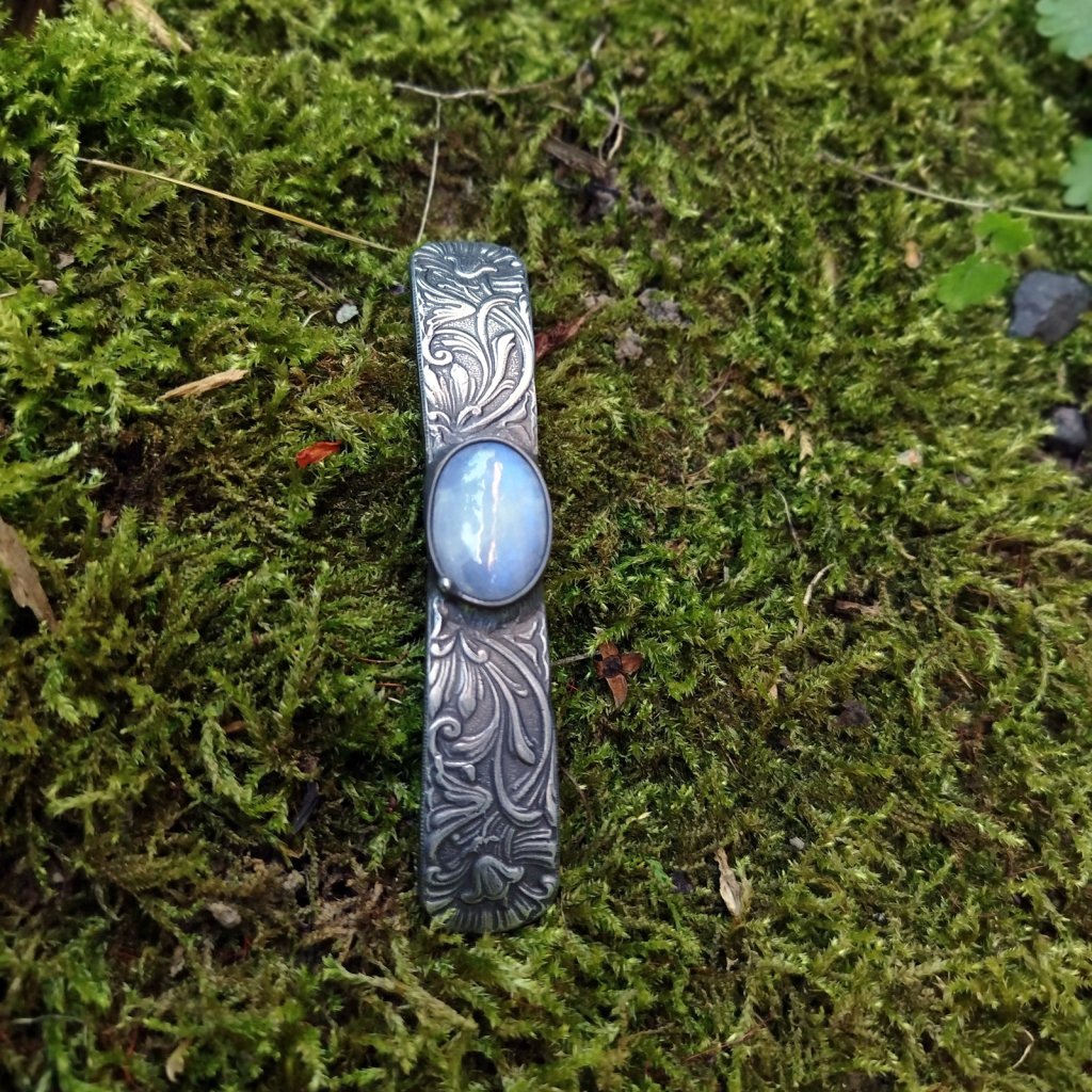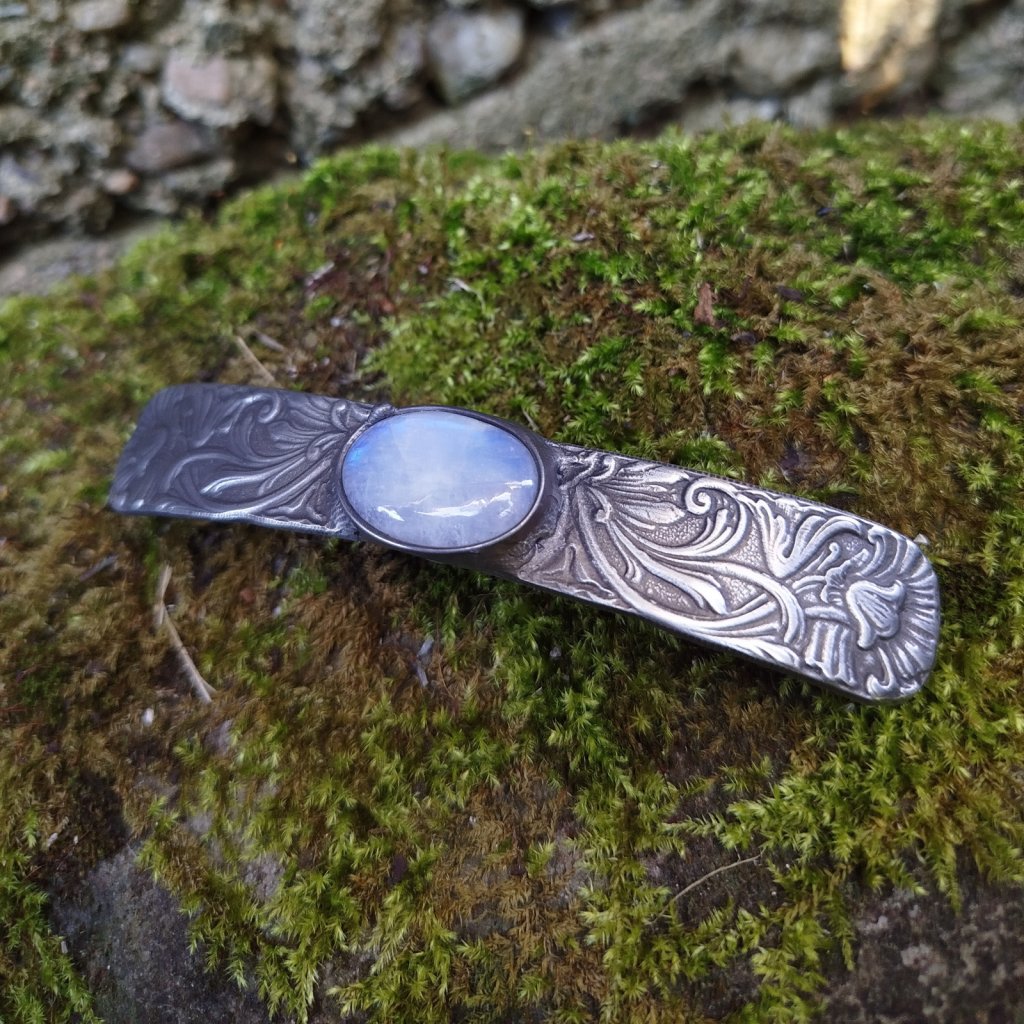 Výjimečná vlasová spona z ručně odlévaného cínu s jemným florálním motivem a měsíčním kamenem. Jedná se o autorský šperk, který spojuje umění, funkčnost a sílu přírodních materiálů.