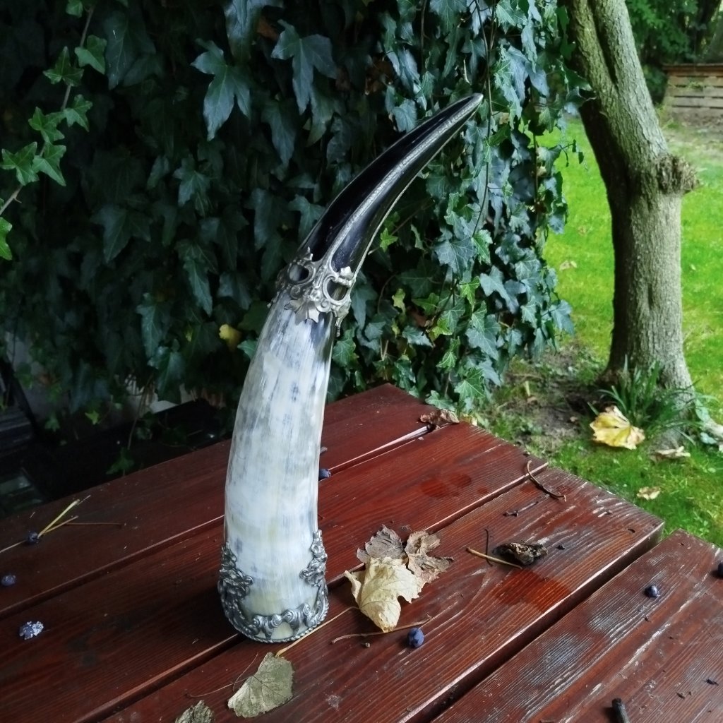 Dekorační roh bohatě zdobený cínovou montáží s motivy z keltské mytologie.